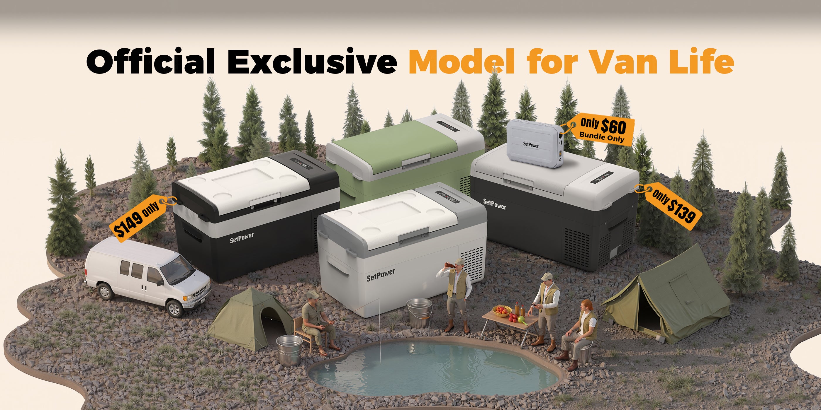 SetPower 12V fridge runs on ultra-low power, as low as 28W. A portable refrigerator freezer built for energy savings and long trips.