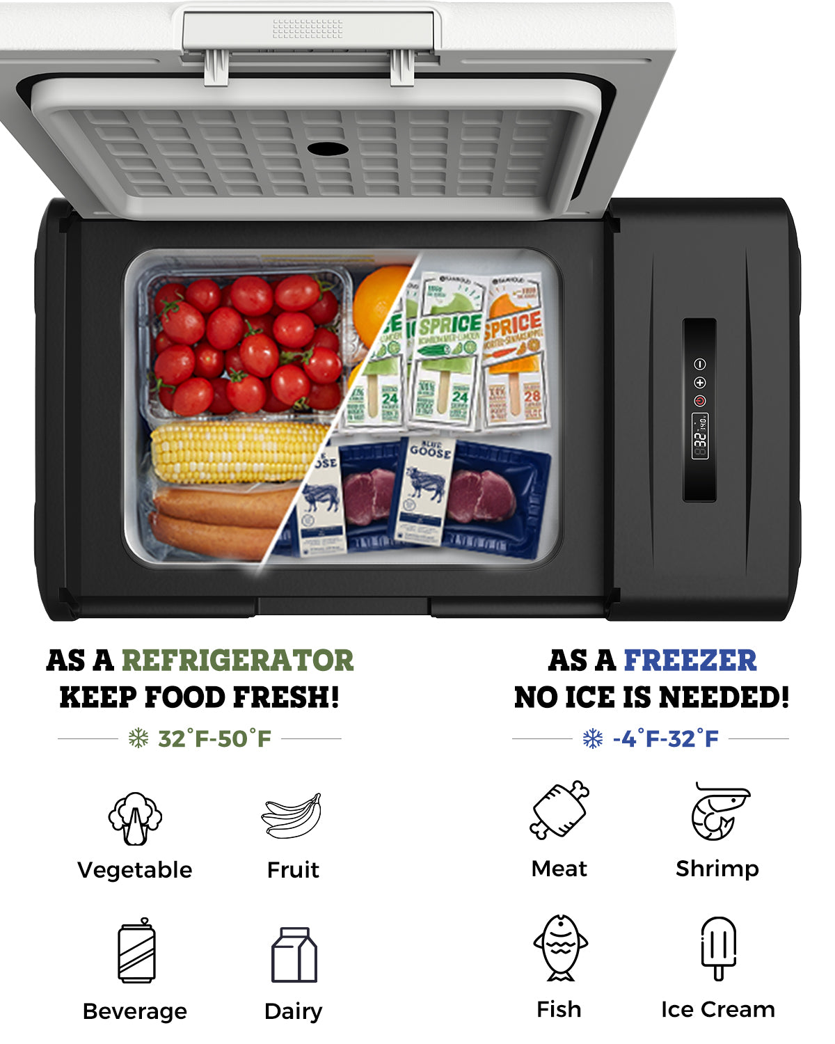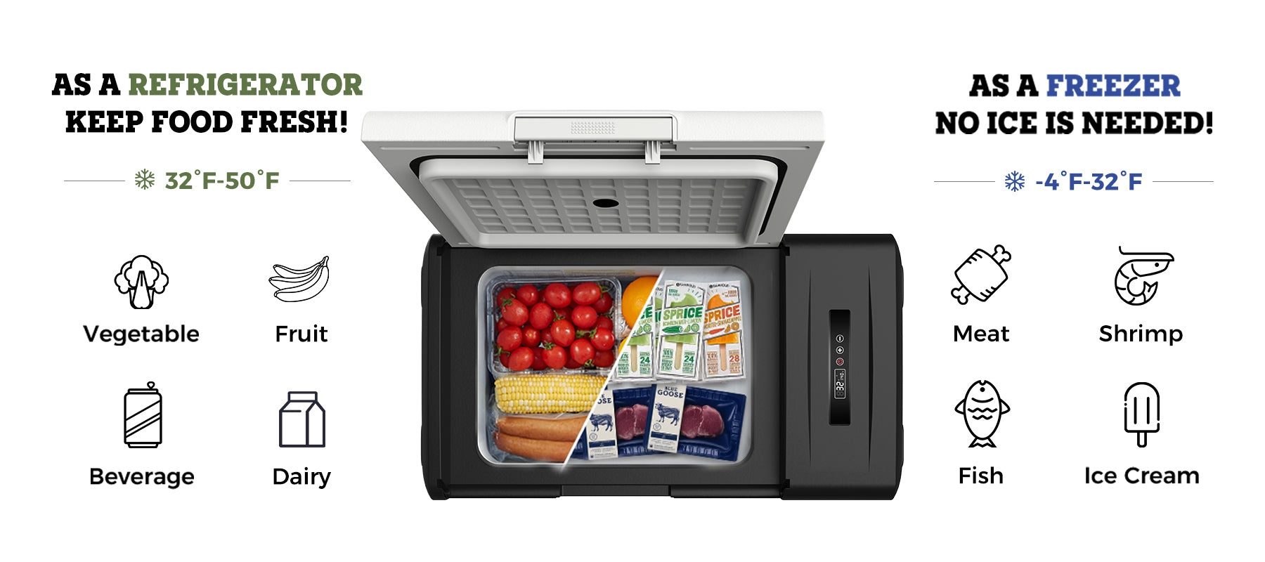 Yes, our portable fridge is versatile and can function as both a refrigerator and a freezer. Whether you're using it as a 12V fridge for camping, overlanding, or in your SUV, it can easily switch between cooling and freezing. Adjust the settings to store fresh food or freeze items like ice cream and meats. This 12V freezer is perfect for your car life, outdoor gear, or even in your camper or truck.