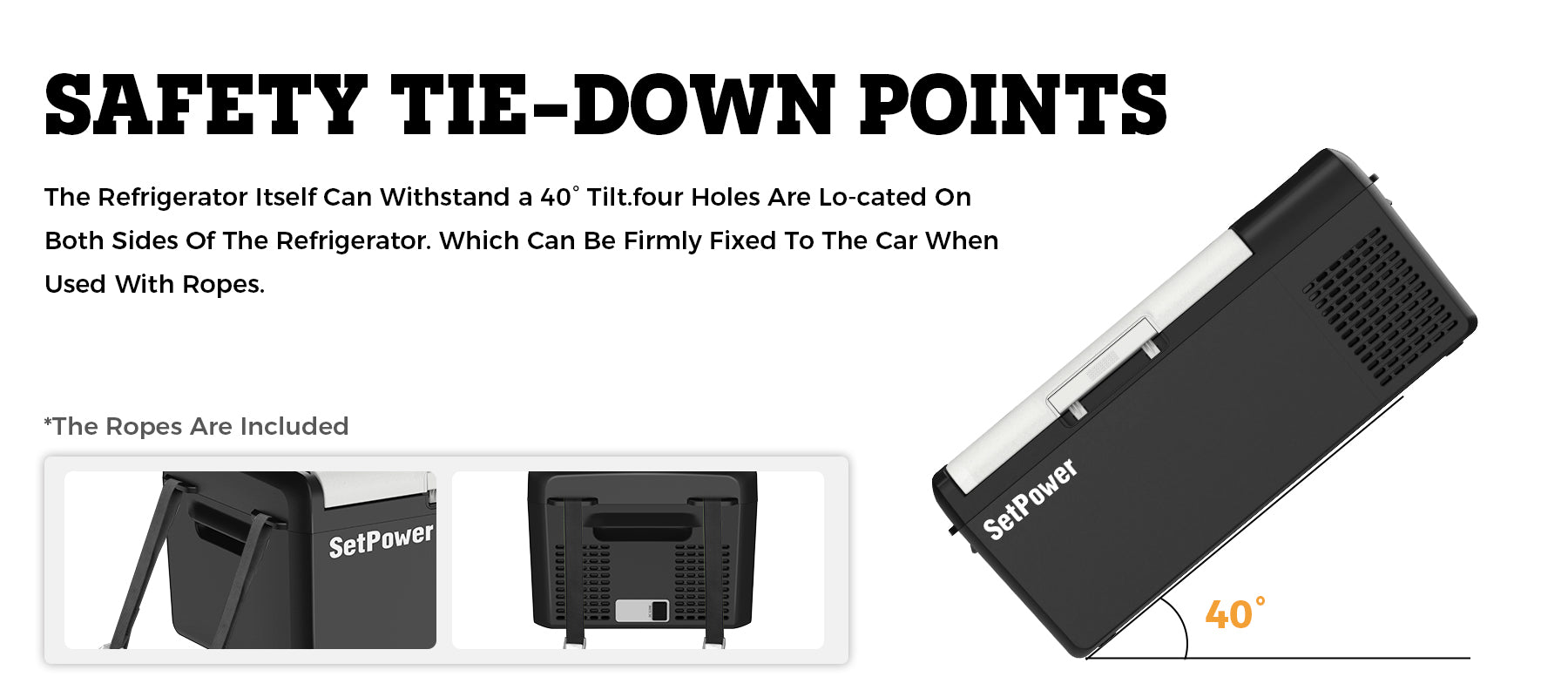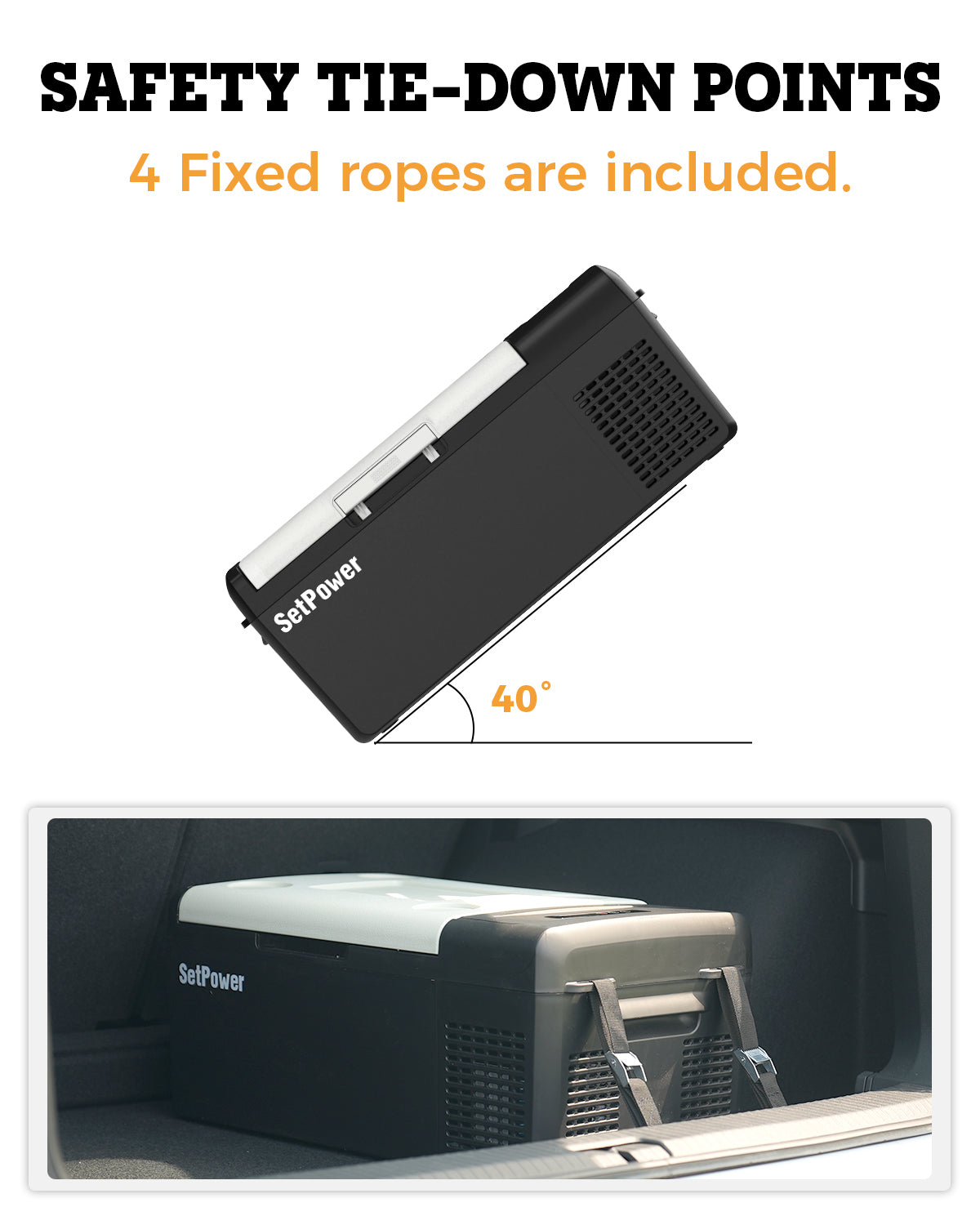 The SetPower MC15 portable refrigerator comes with 4 free tie-down straps to keep your 12v fridge freezer stable during off-road trips. Perfect as a car fridge freezer or 12v cooler, it secures safely in your vehicle, keeping food and drinks ice-cold and reliable on every adventure.