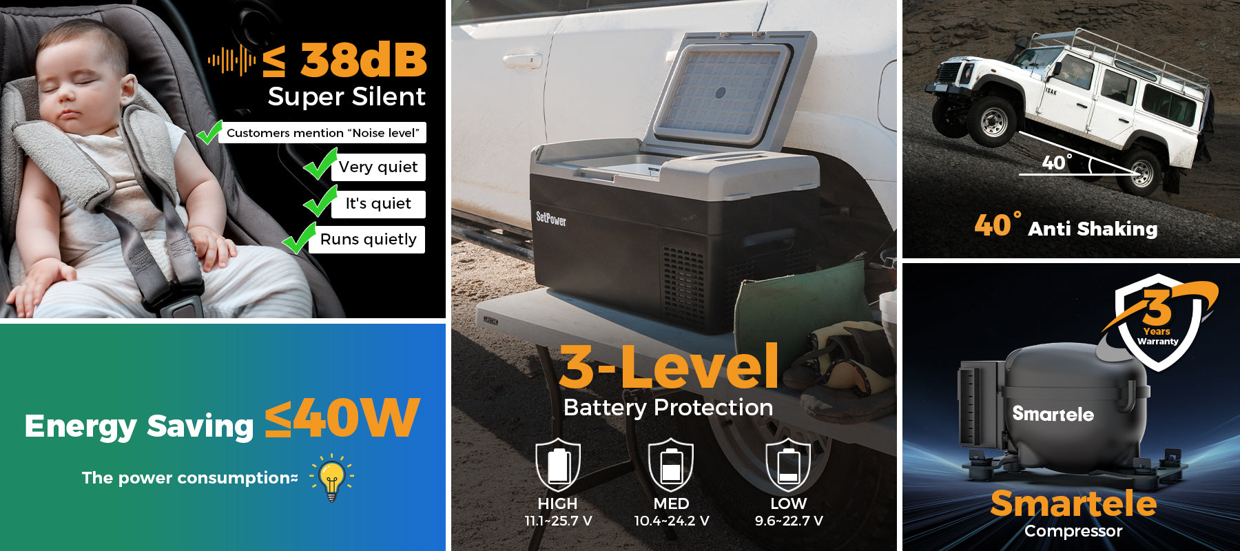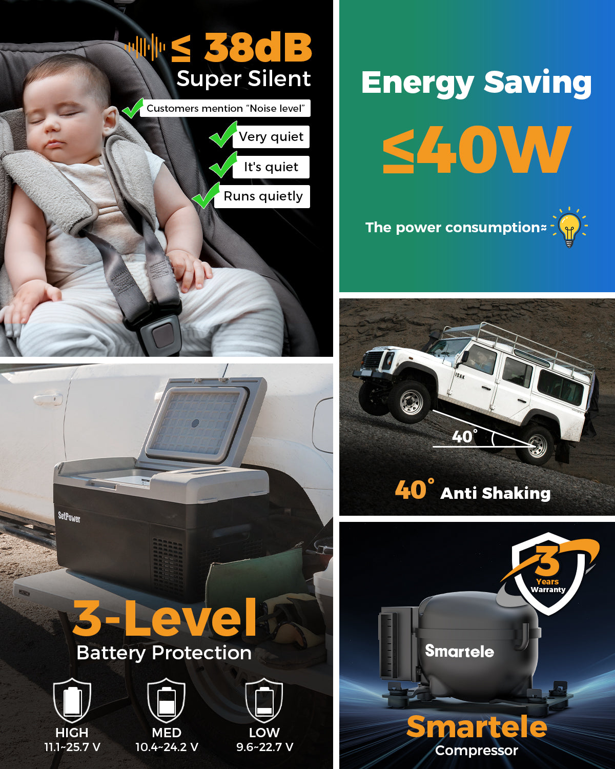 Runs Quietly ≤38dB - The SetPower FC20 car refrigerator is perfect for quiet camping trips, van life, and road adventures. Operating at ≤38dB, over 90% of users report barely hearing the compressor or fan while running. This portable refrigerator for camping and 12V refrigerator for car delivers reliable cooling without noise, making the SetPower refrigerator ideal for overnight trips, RVs, or keeping your van peaceful while on the move.