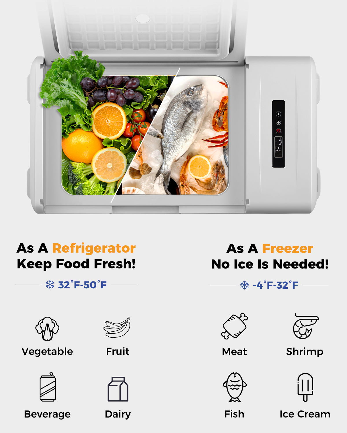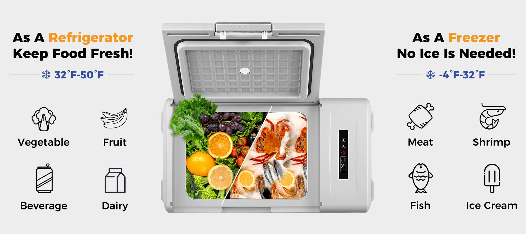Yes, our portable fridge is versatile and can function as both a refrigerator and a freezer. Whether you're using it as a 12V fridge for camping, overlanding, or in your SUV, it can easily switch between cooling and freezing. Adjust the settings to store fresh food or freeze items like ice cream and meats. This 12V freezer is perfect for your car life, outdoor gear, or even in your camper or truck.