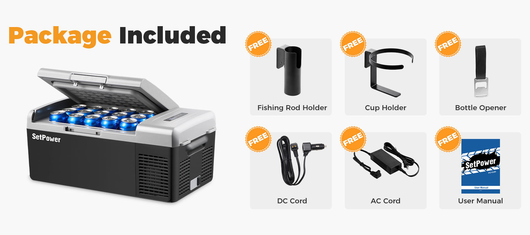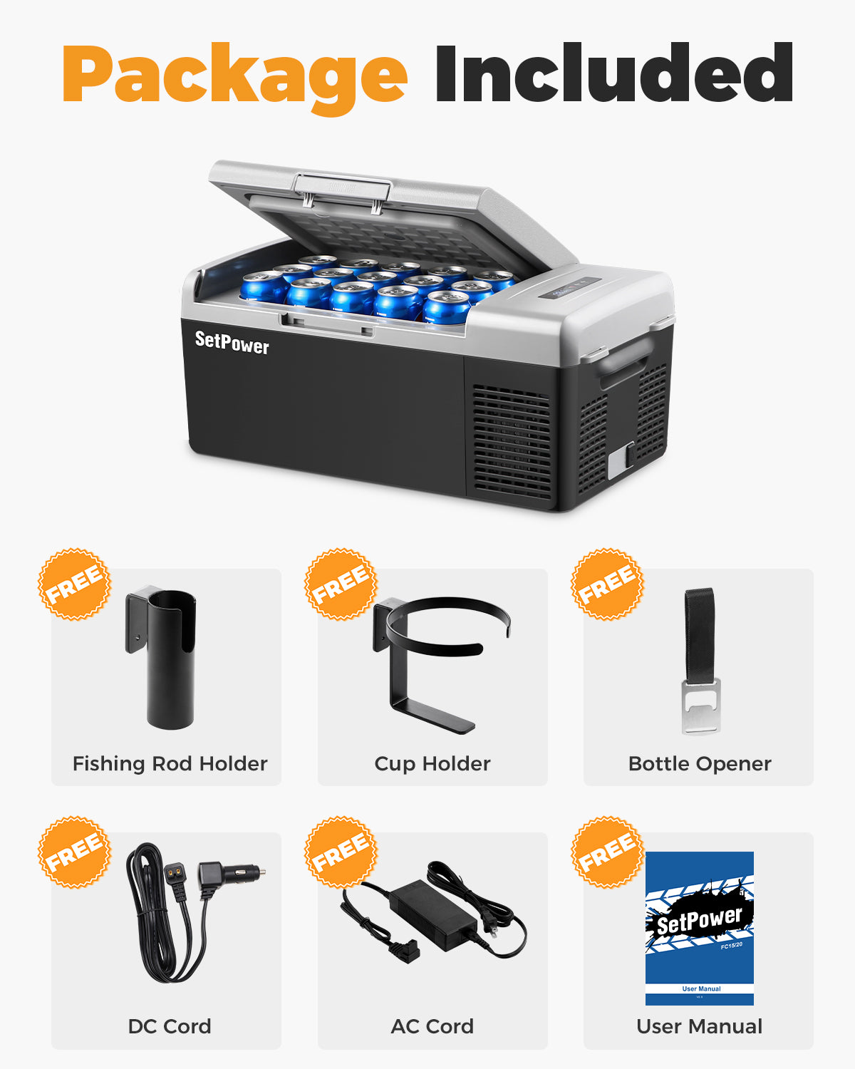 • Package includes: Setpower fc15 or fc20 12v Fridge, AC adapter 110 ~ 240V, 12V/24V Car Cigarette Lighter, User Manual, Cup Holder, Umbrella/Fishing rod holder, Bottle opener