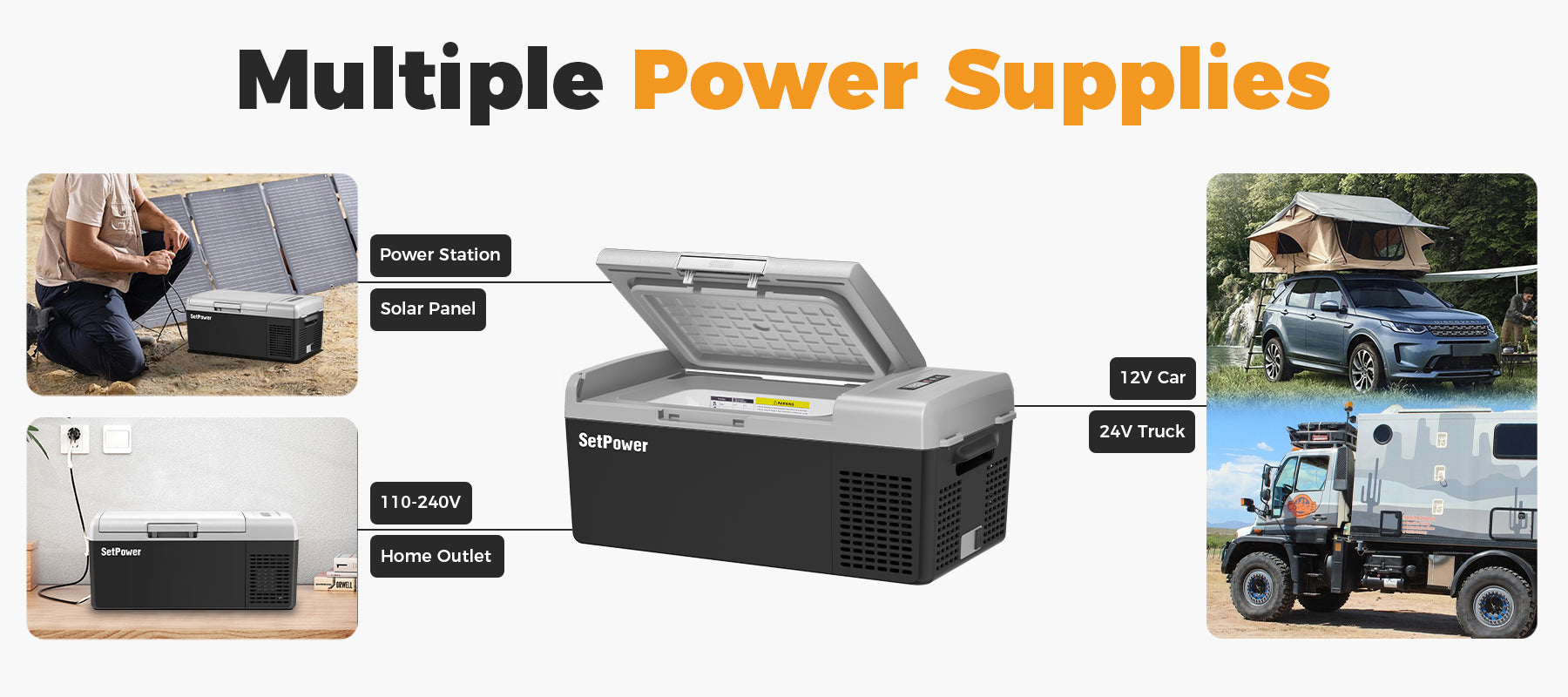 Comes with Free Outdoor Tool Kit - SetPower FC20 car refrigerator is a compact and portable refrigerator perfect for van life and RV enthusiasts. This car refrigerator includes a $15 outdoor tool kit with cup holders, fishing rod holder, and bottle opener. Designed to fit anywhere in your van, the SetPower FC20 also comes with both an AC adapter and DC car plug — a powerful, versatile SetPower refrigerator for every outdoor trip.