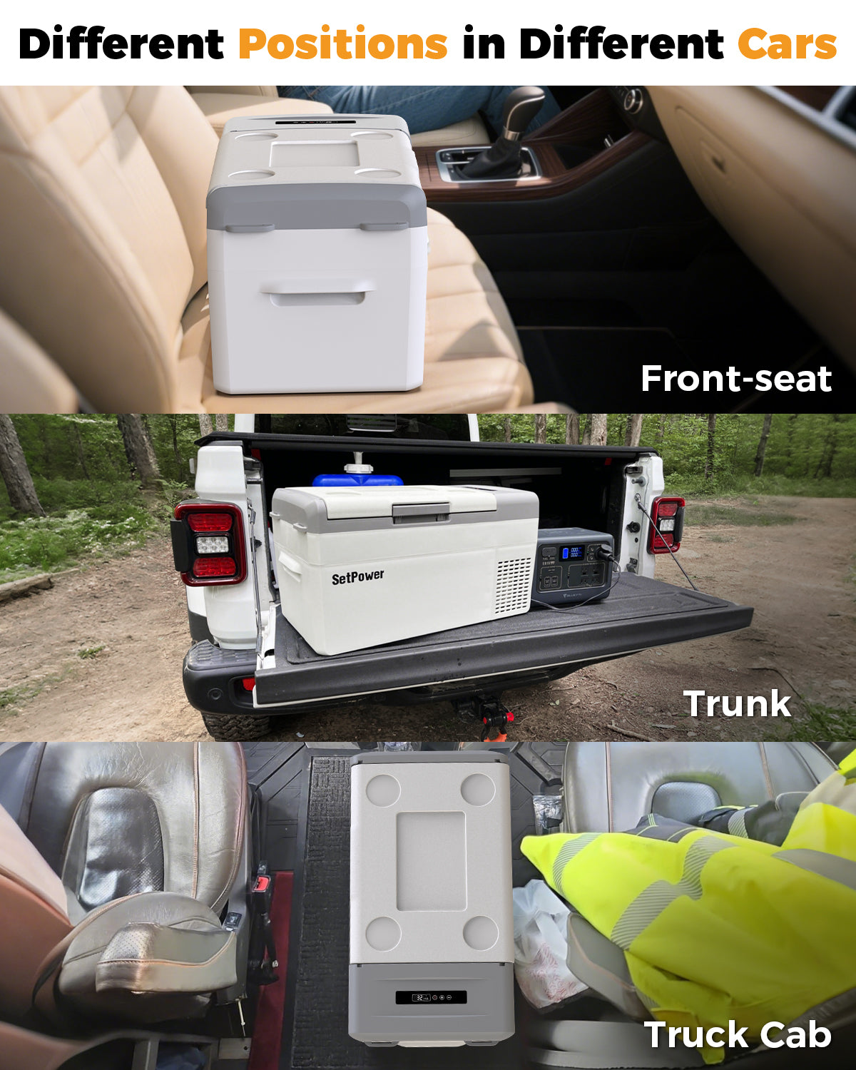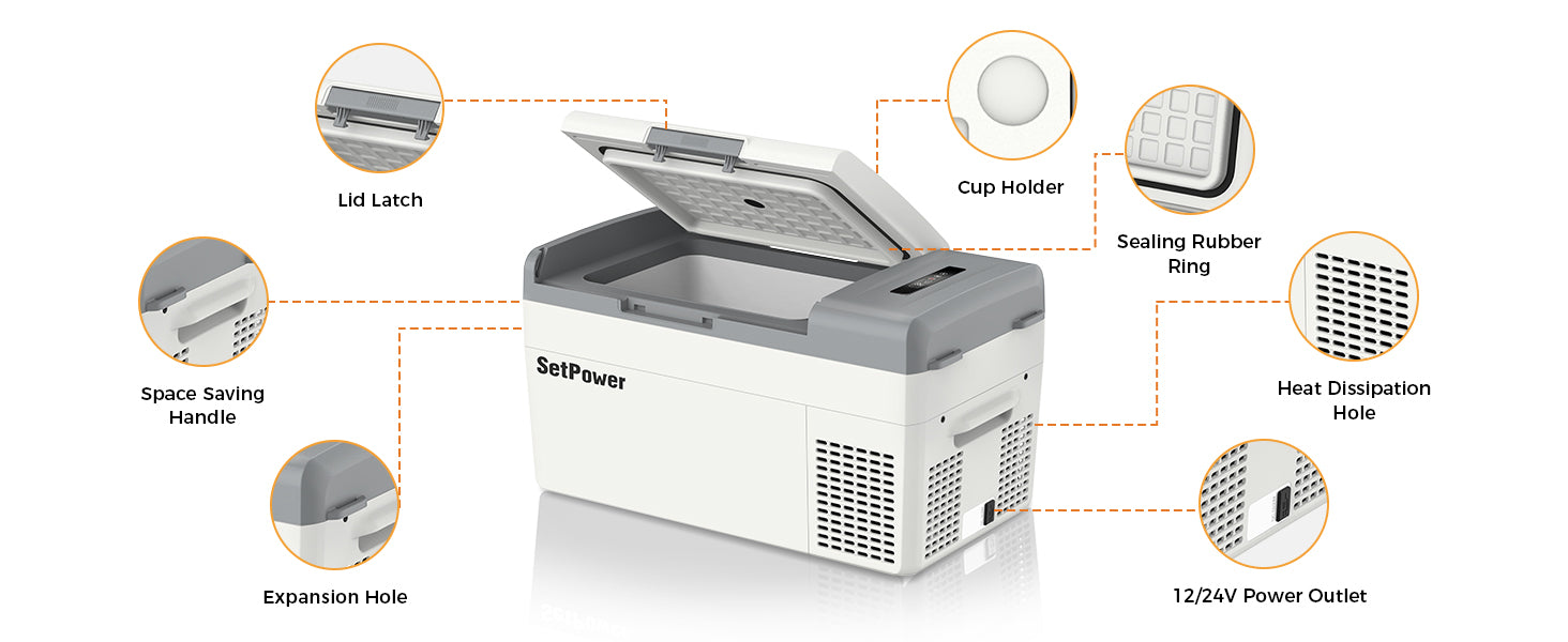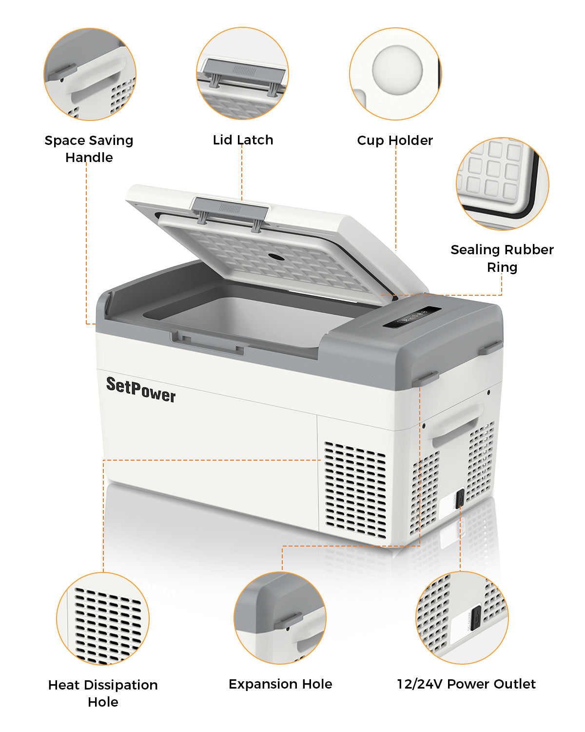 User-Friendly Design - The SetPower MC20 electric cooler's removable lid features 4 handy cup holders, making it easy to enjoy drinks on the go. With triple battery protection, this electric cooler ensures safe and reliable operation. Compact yet versatile, the SetPower cooler keeps food and drinks fresh wherever your journey takes you, making it the ideal camping refrigerator/freezer portable.