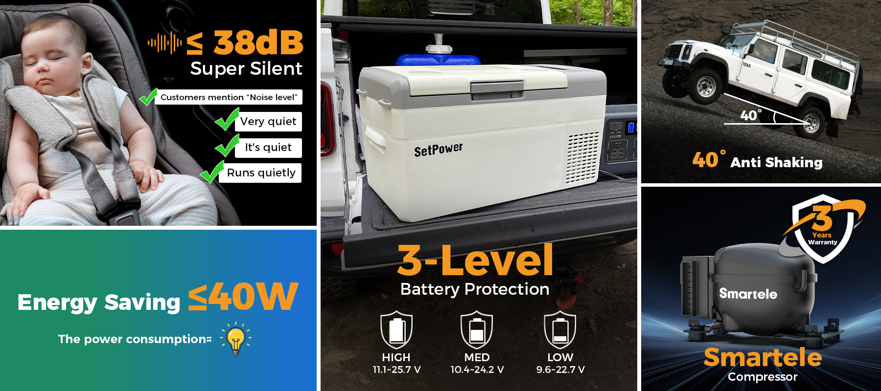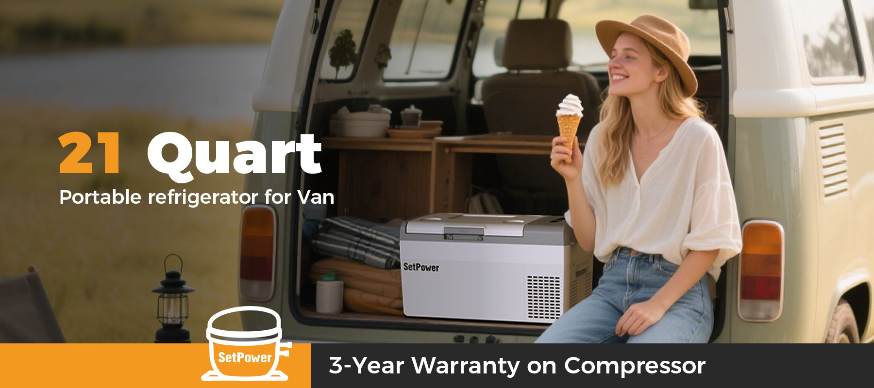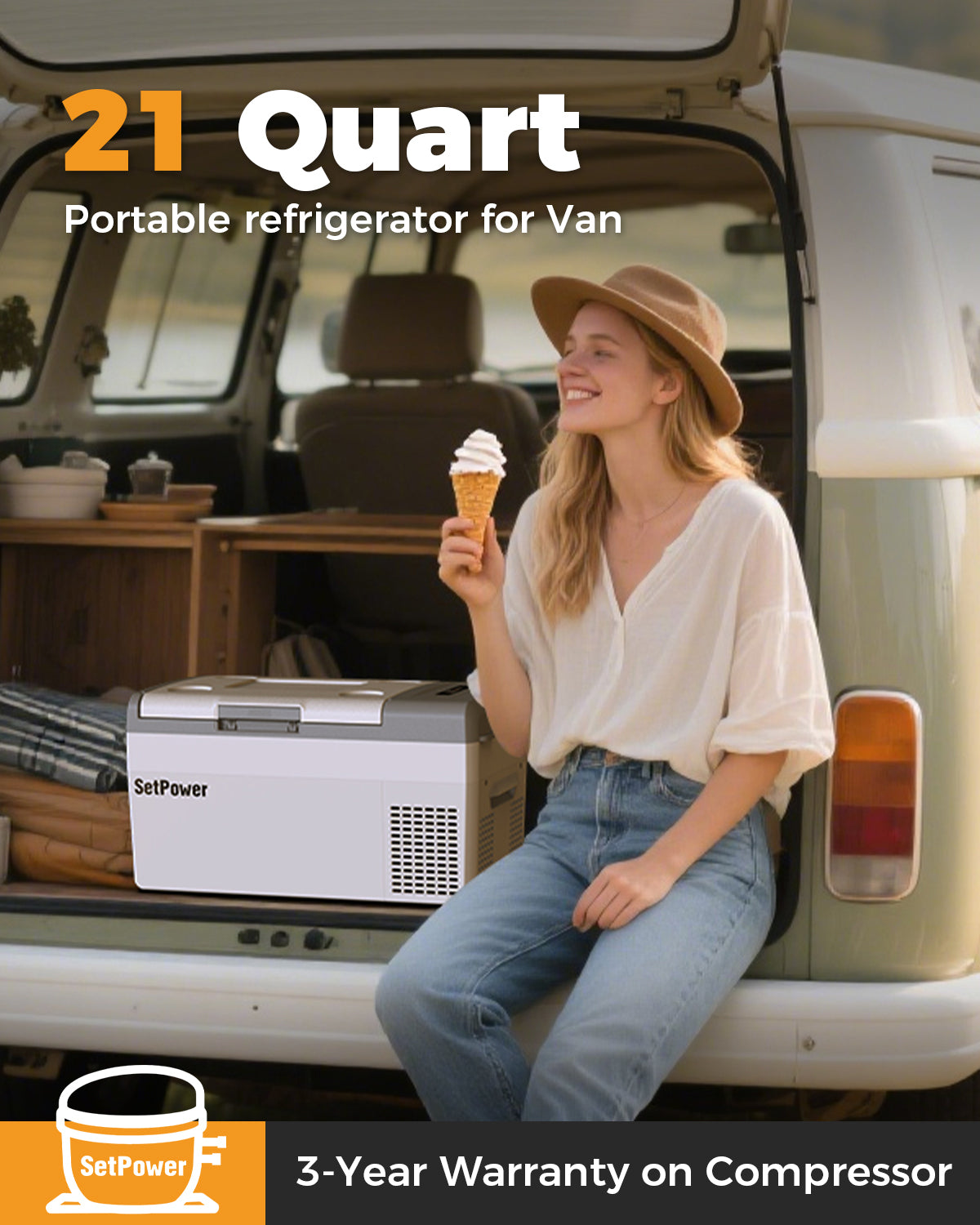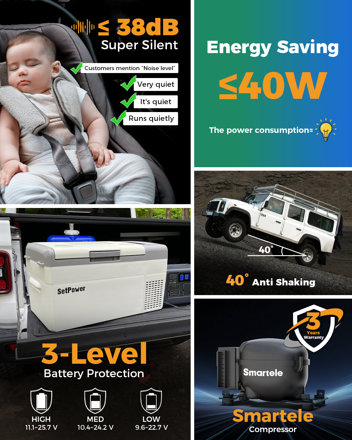 Runs Quietly 38dB - The SetPower MC20 electric cooler is perfect for quiet camping trips, van life, and road adventures. Operating at ≤38dB, over 90% of users report barely hearing the compressor or fan while running. This electric cooler for camping or car delivers reliable cooling without noise, making the SetPower cooler ideal for overnight trips, RVs, or keeping your van peaceful while on the move.