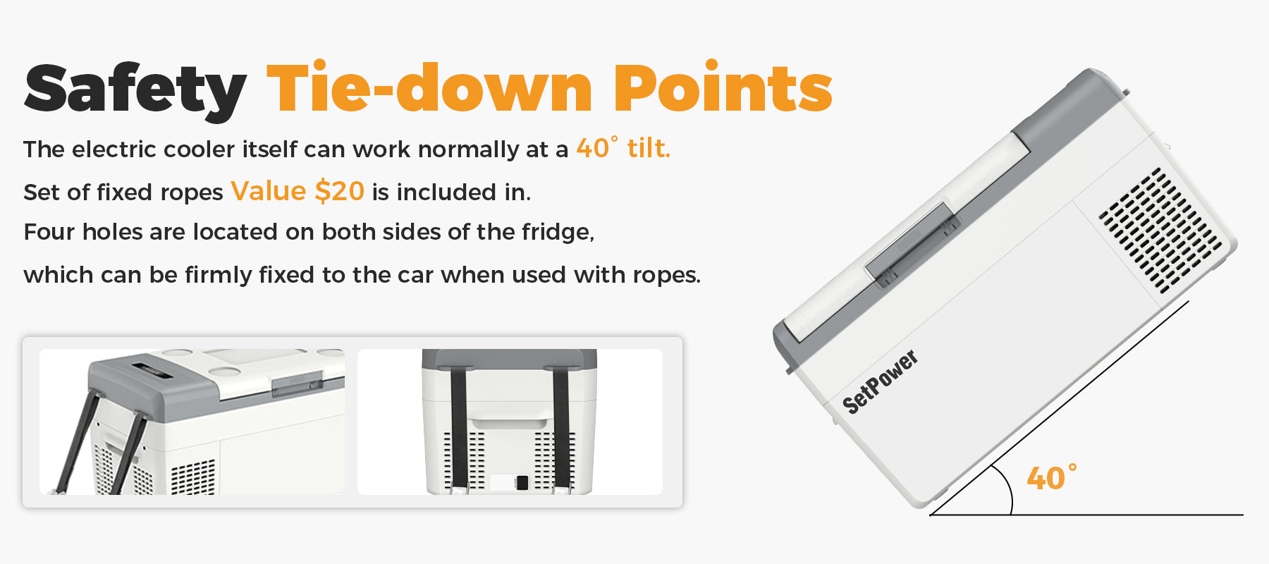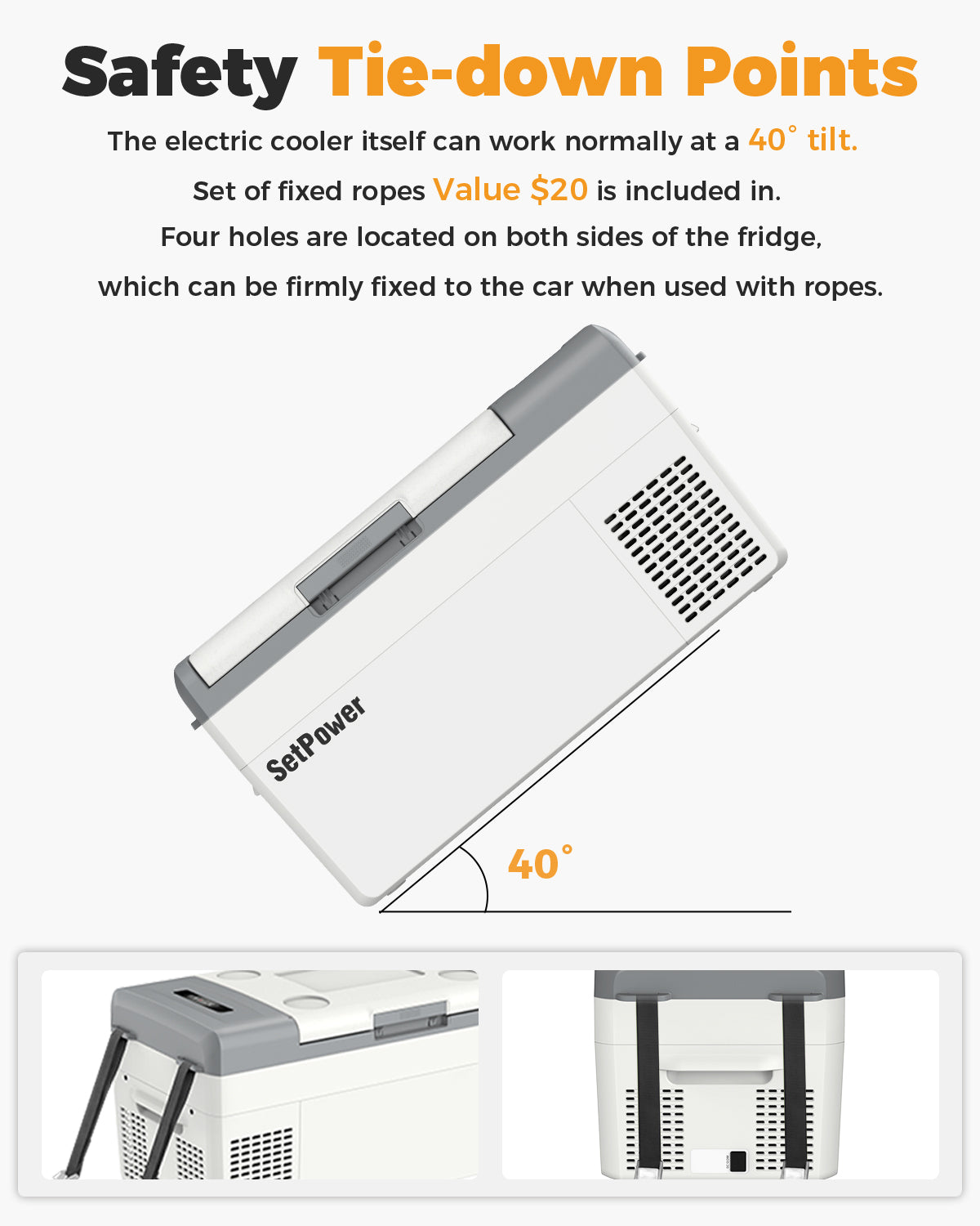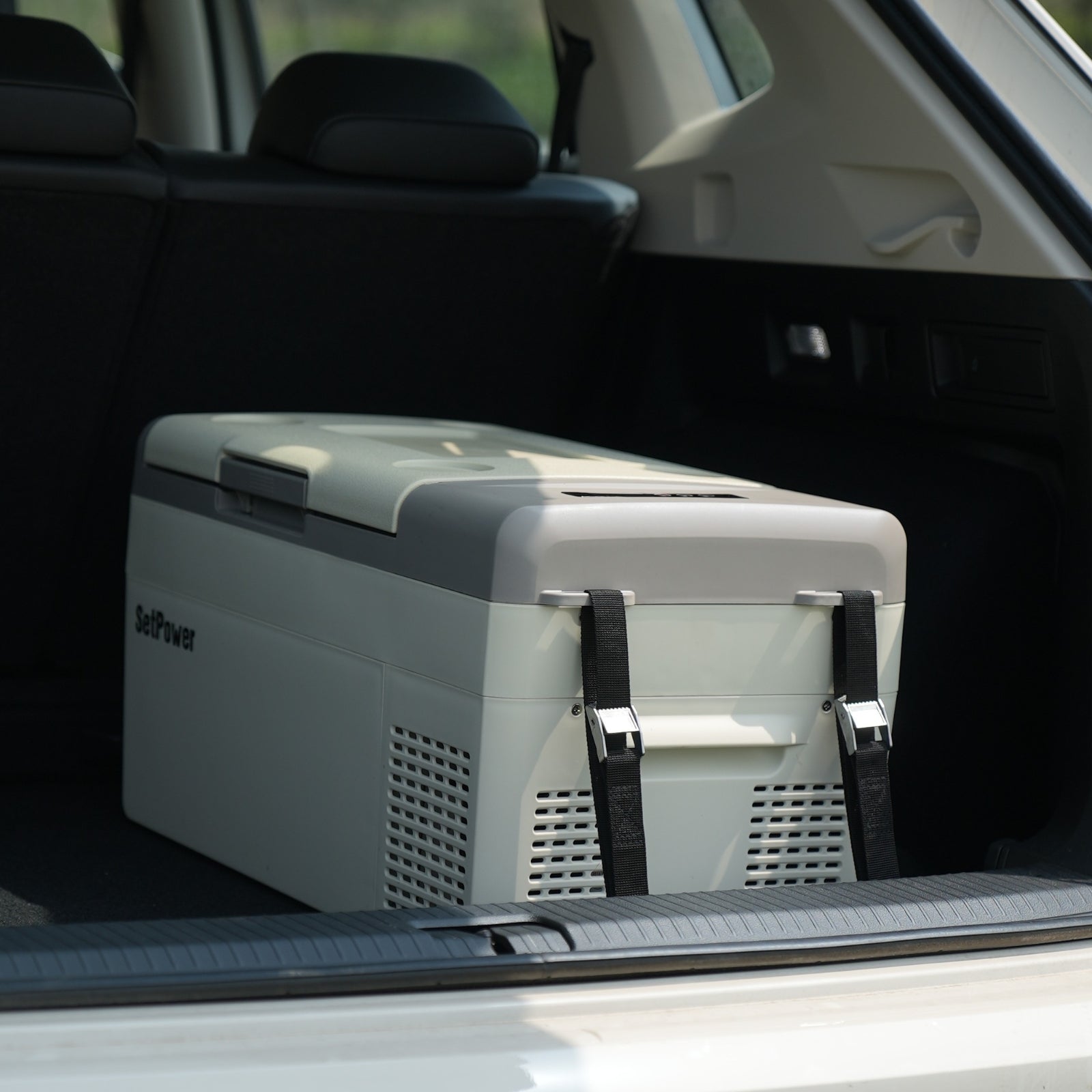 Secure Anywhere with 4 Free Strong Straps - The SetPower MC20 is the perfect electric cooler for van life, RV travel, and off-road adventures. It includes 4 durable fixing straps that keep this electric cooler stable while driving or exploring rough terrain. Designed for flexibility, this electric cooler also comes with both an AC adapter and a DC cigarette plug, making it easy to power anywhere. Compact yet powerful, it’s also ideal as a second fridge for RV owners.