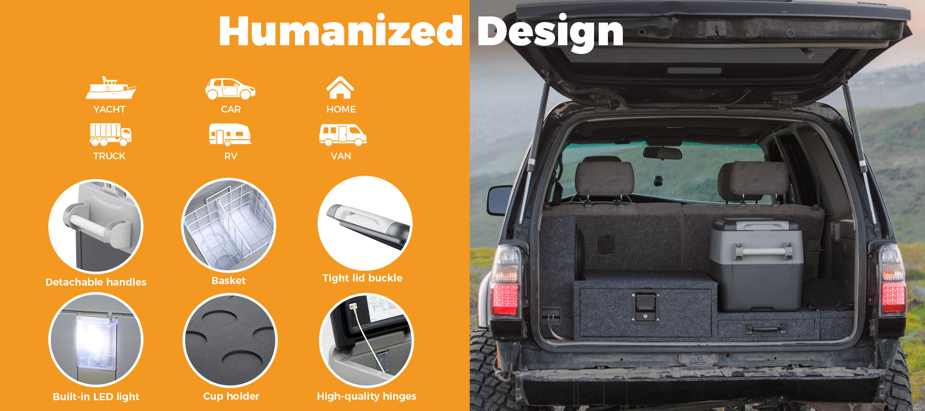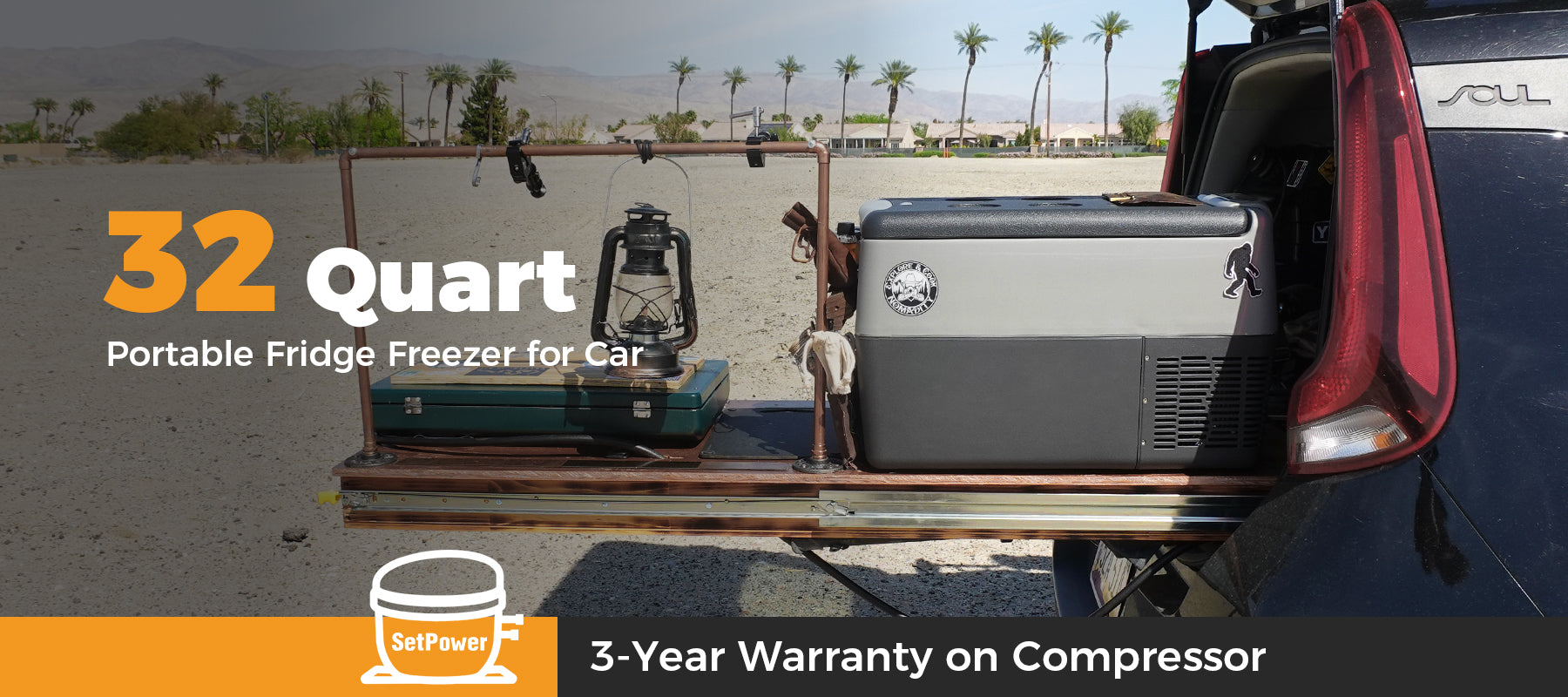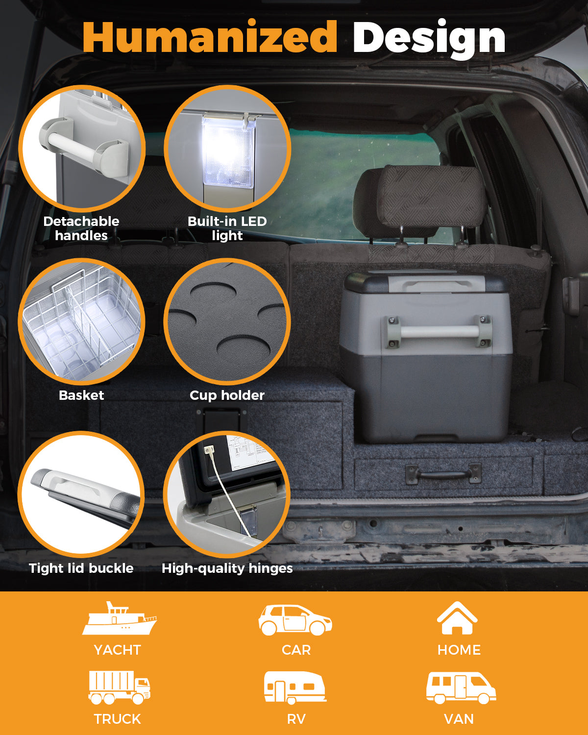 【SetPower AJ30】 The perfect size fits for your truck or van. With a 32Qt capacity and a compact, slim design, this car refrigerator’s ideal for the driver's seat or back seat. At just 23 inches, this affordable refrigerator is built to save space without compromising on cooling power. Perfect for those on the go, the SetPower AJ30 offers convenience, reliability, and efficiency in a compact package.