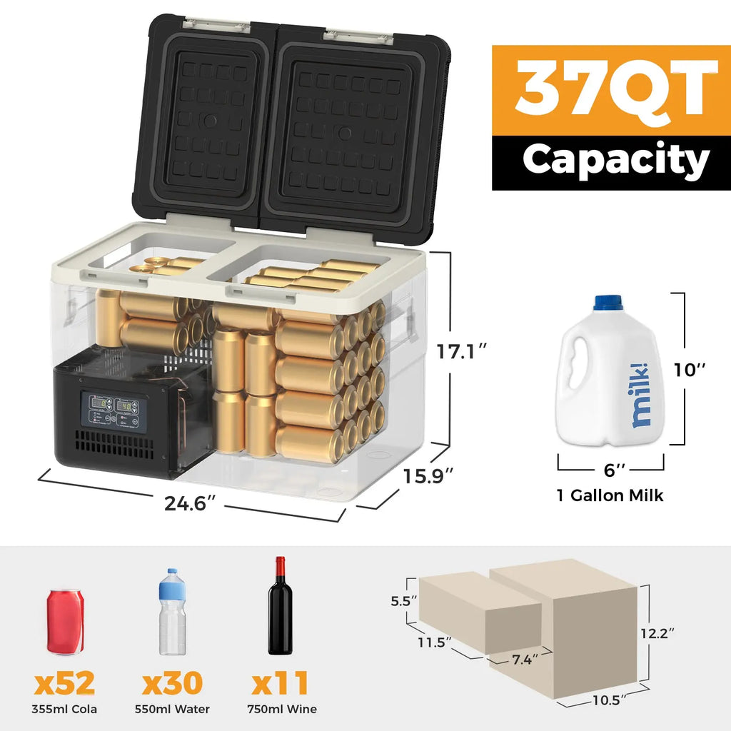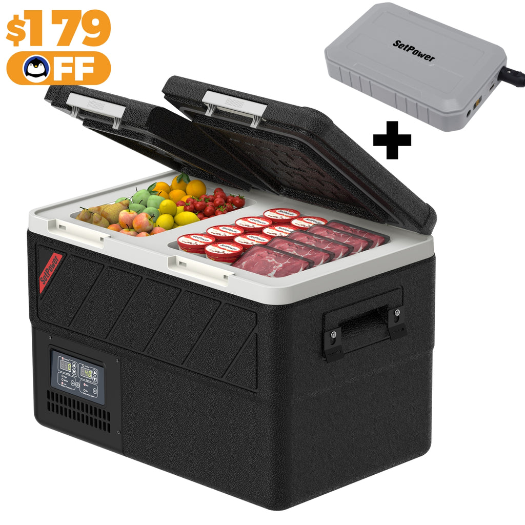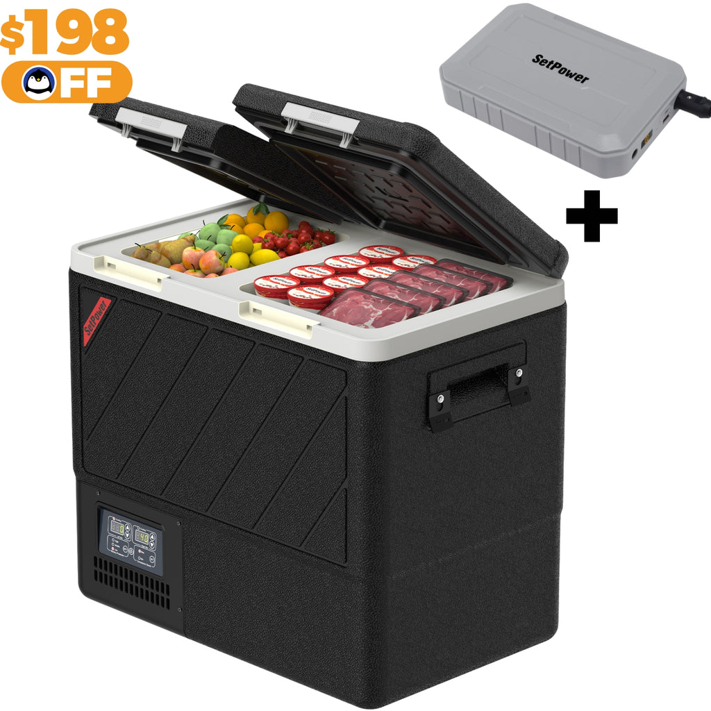 Setpower True Dual-Chamber Car Refrigerator - separate compartments for storing essentials like icy drinks and ice cream at the same time. This 12 Volt Refrigerator’s precision dual controls keep each zone perfectly chilled or frozen from -4°F to 68°F. No compromises, no cross-taste. Travel smarter, savor fresher.