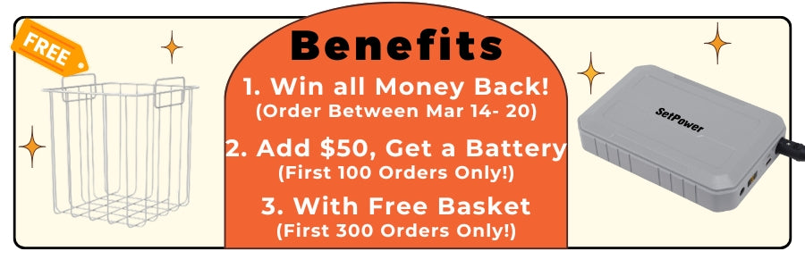 Setpower Car Fridge Freezer runs whisper-quiet (≤35dB) with ultra-low energy consumption: 38W in Eco Mode, 50W max cooling. Eco-smart, power-wise, always reliable! Plus the setpower's triple battery protection, you'll always stay cool without draining your battery, Perfect for road trips, camping, or daily commutes.