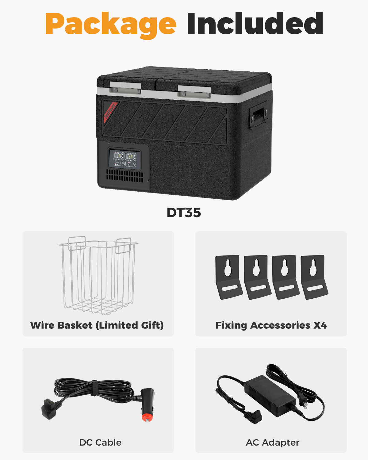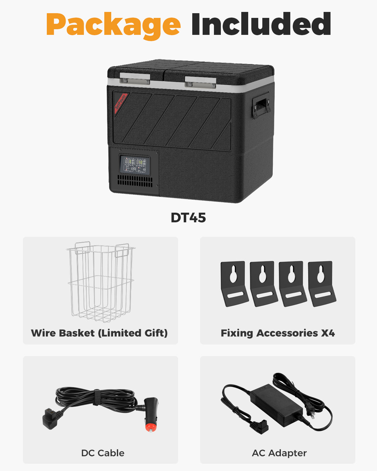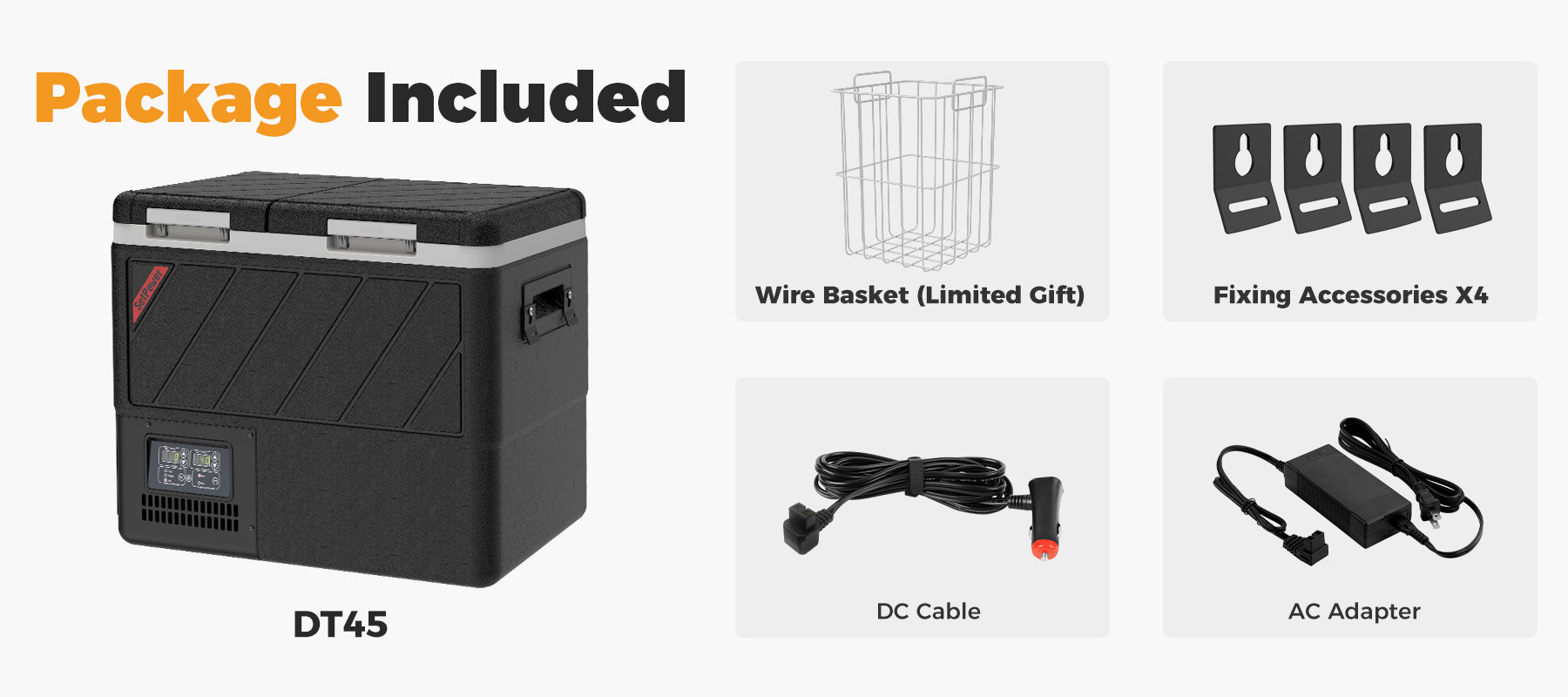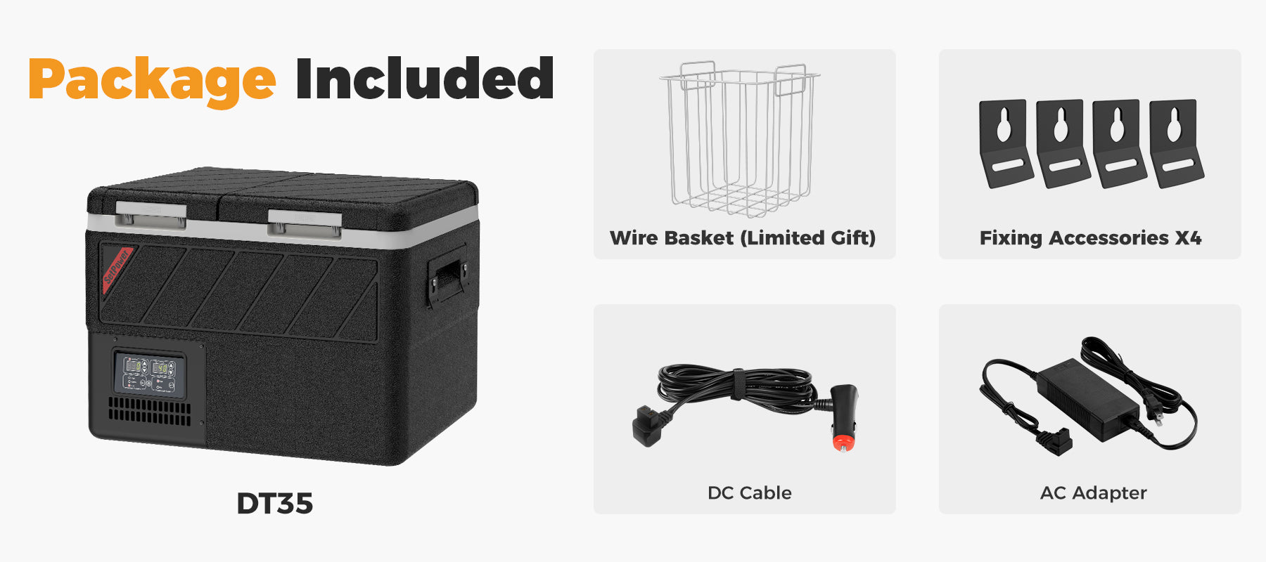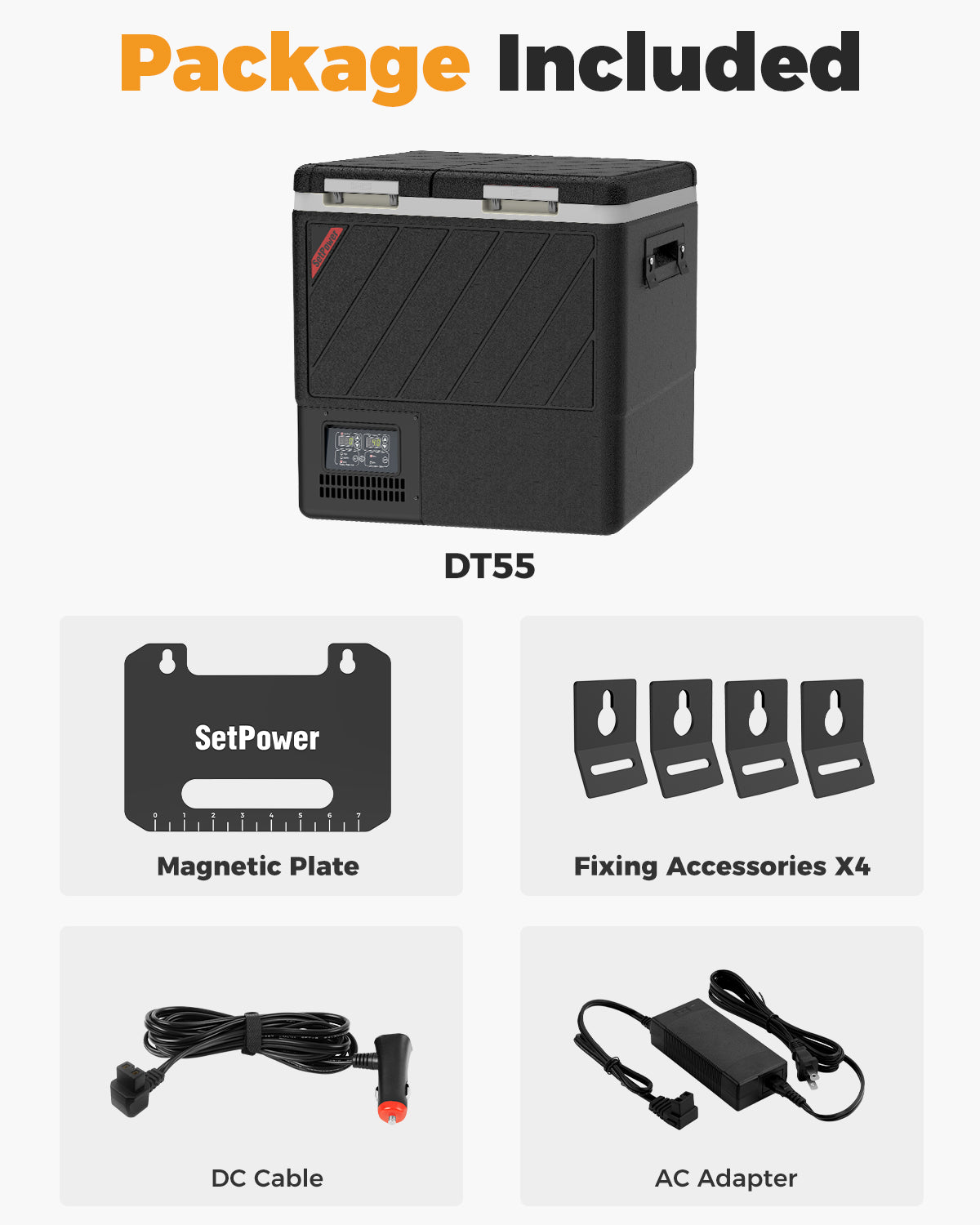 • Package includes: Setpower DT35/45/55 12v Fridge, AC adapter 110 ~ 240V, 12V/24V Car Cigarette Lighter, User Manual (Basket or Magnetic board - Limited stock)