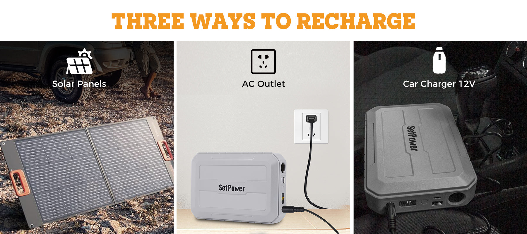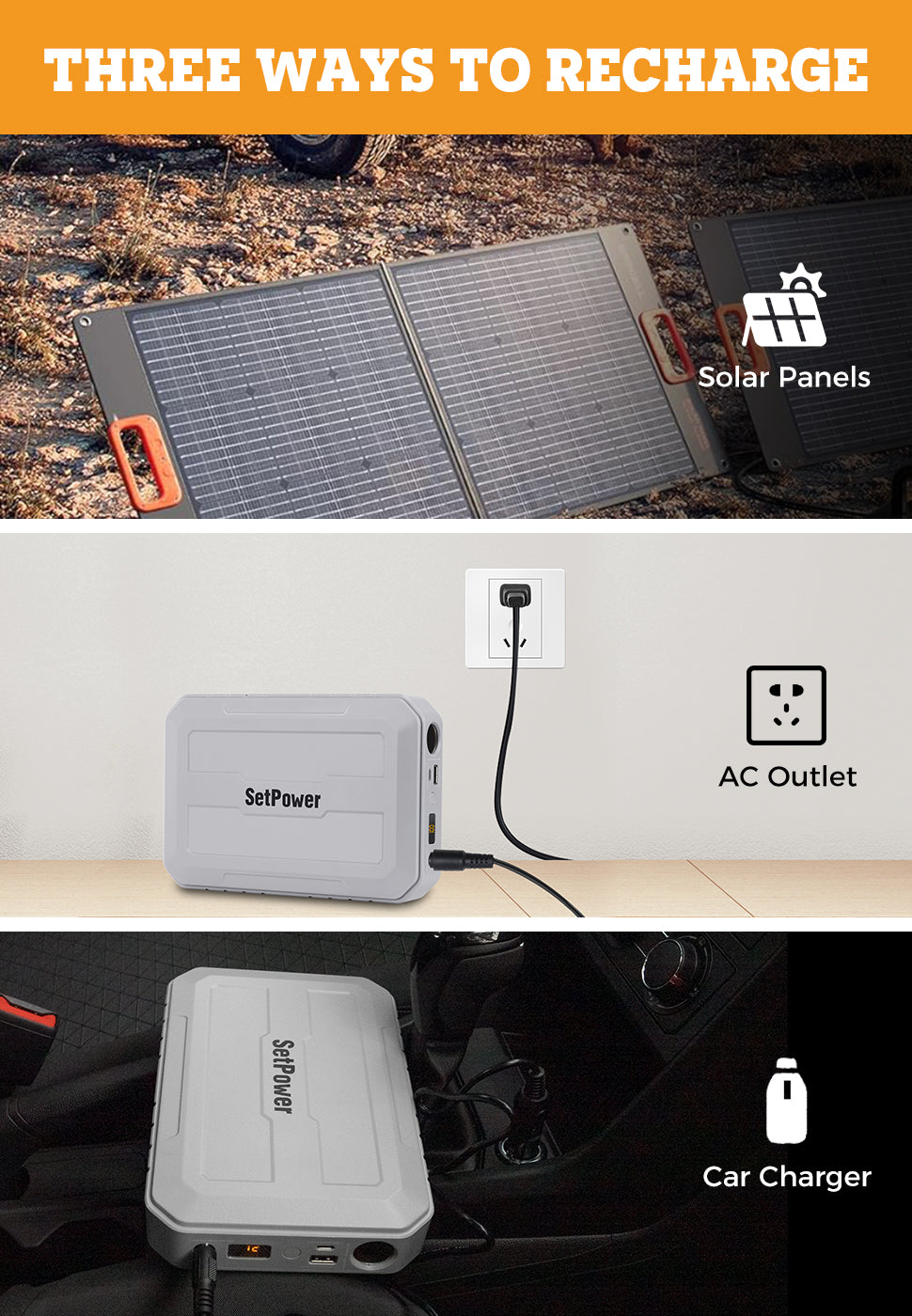 3-Hour Faster Recharging - This portable battery uses three fast-charging technologies to store energy for the battery, using solar panels outdoors, a household AC plug at home, and a DC cigarette lighter in the car.