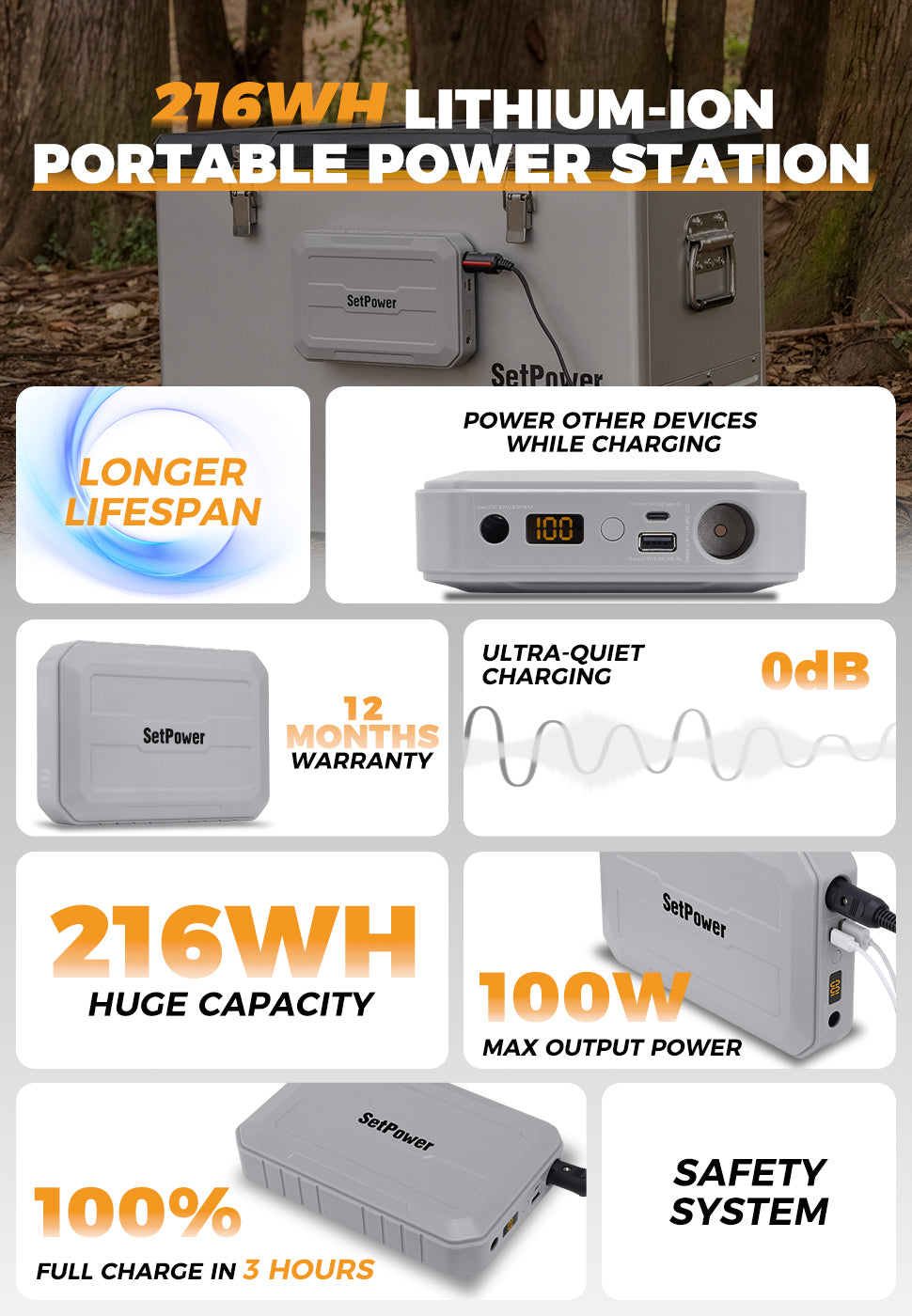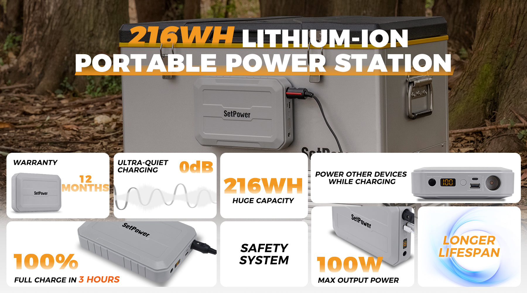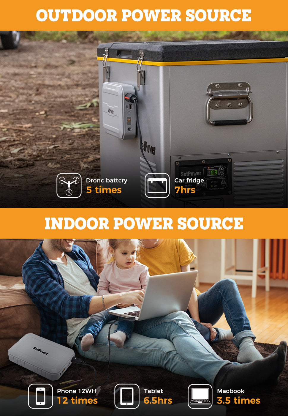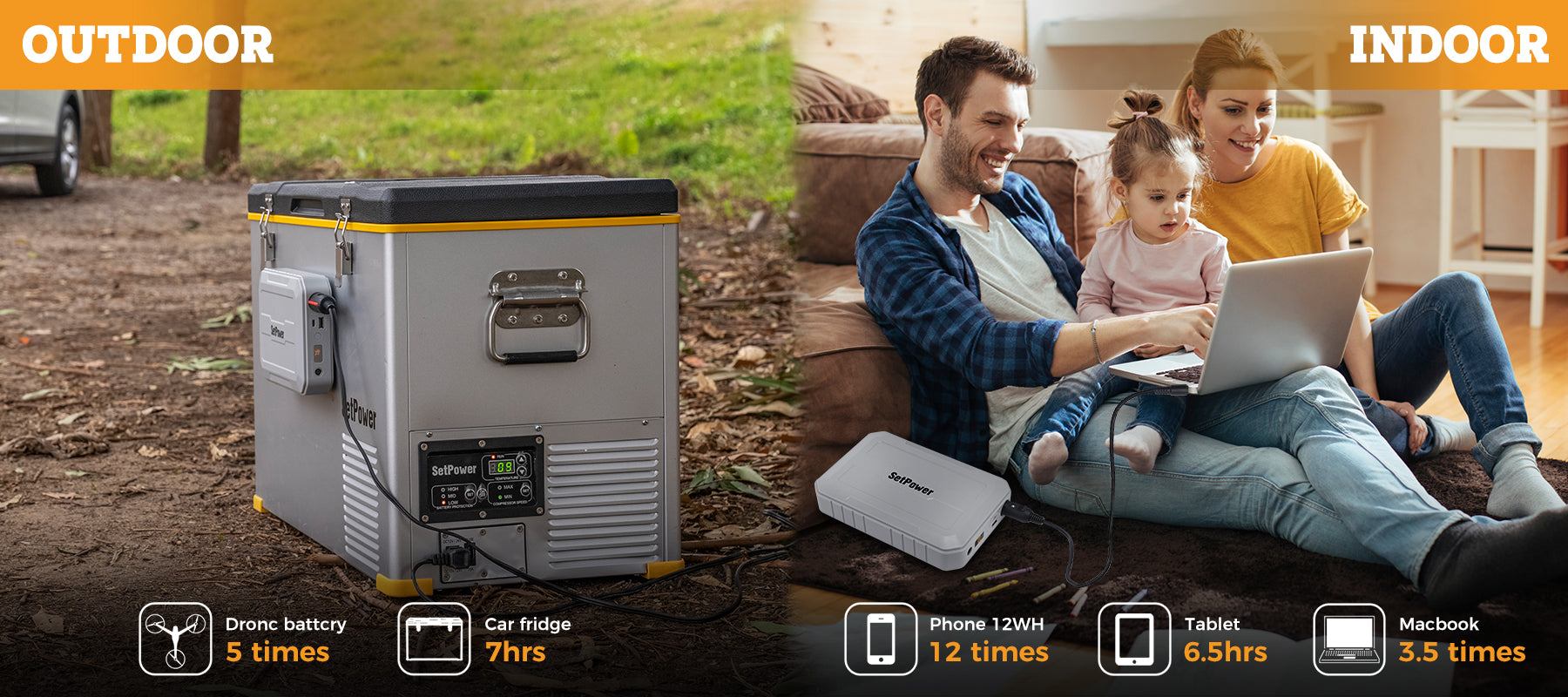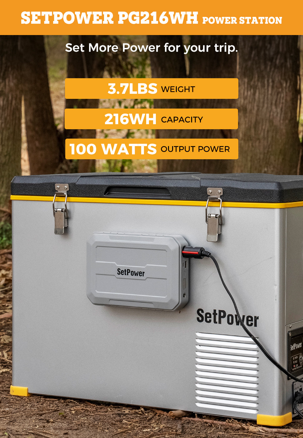 This 216Wh portable battery can power setpower's 15.8 to 37 quart refrigerator for 8 to 10 hours on a full charge. And it can power setpower refrigerators of 42 quart and larger capacity for 6 to 8 hours continuously. Of course, different settings and usage environments will have different data.