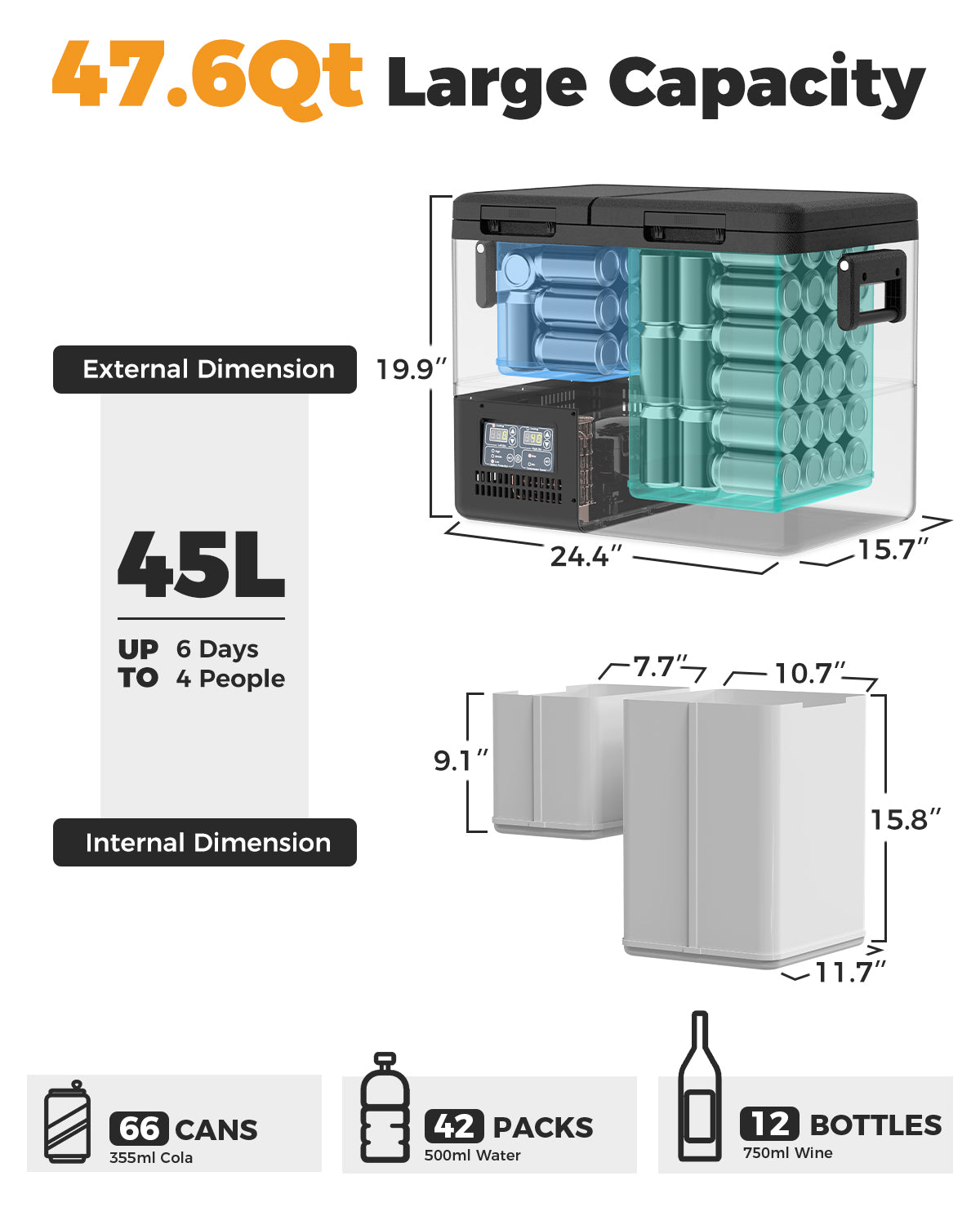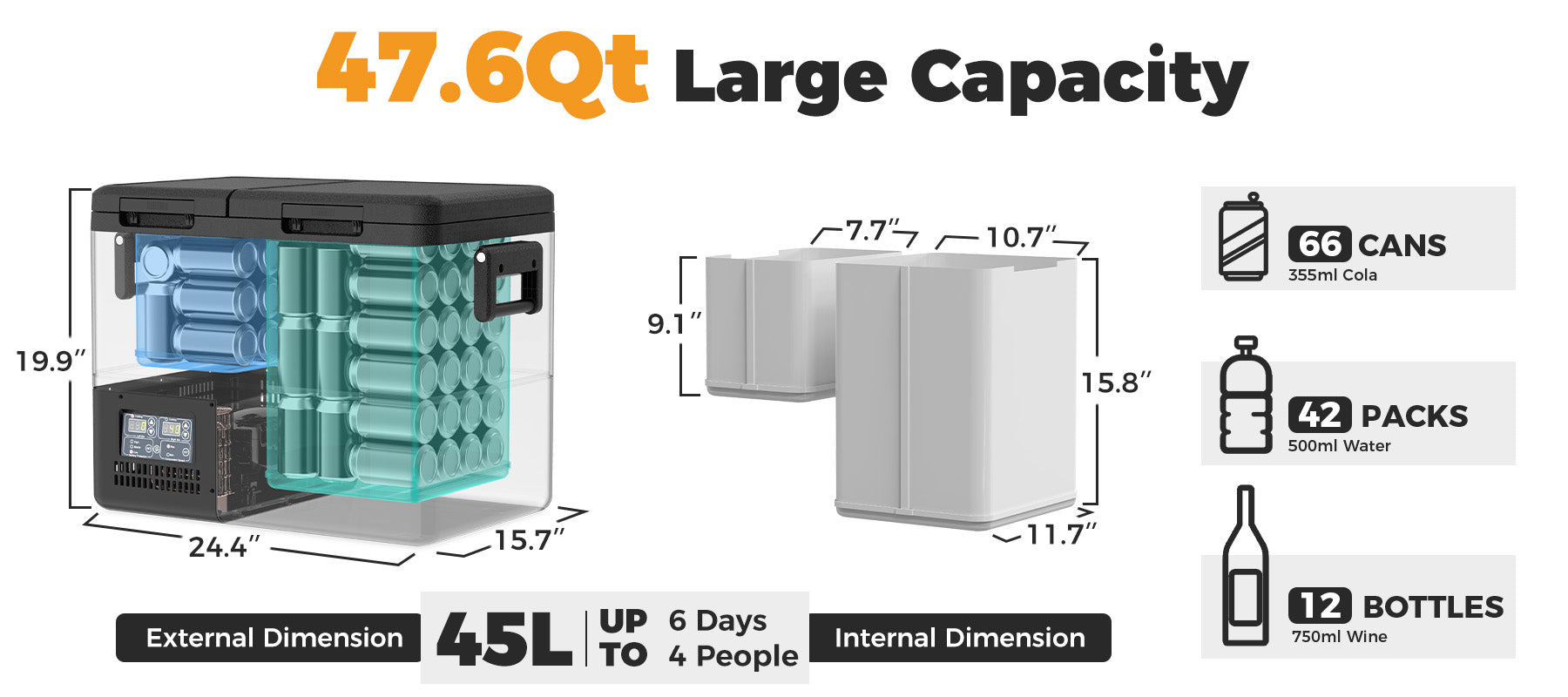 • 47.6Qt PT45: 24.4*15.7*19.9inches, 42lbs