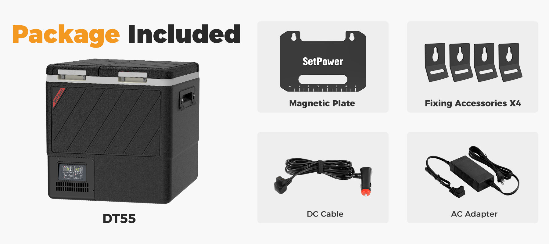 - Package includes: Setpower DT55 12v Fridge, AC adapter 110 ~ 240V, 12V/24V Car Cigarette Lighter, User Manual, Magnetic board